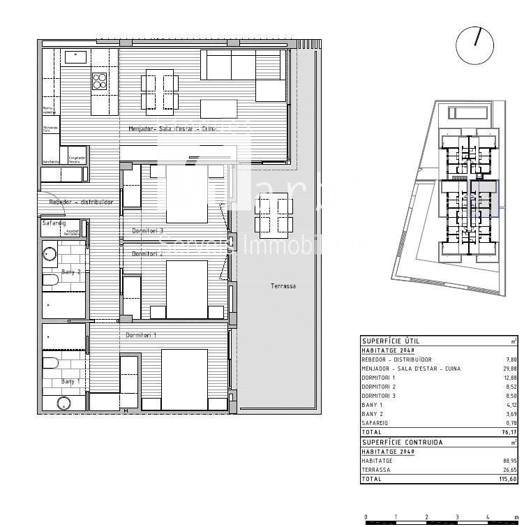 Si desea vivir en un entorno privilegiado cerca de todos los servicios no deje escapar esta oportunidad venga a visitar esta nueva construcción de un edificio plurifamiliar compuesto por 24 viviendas situado en la localidad de Cunit. .Este bloque de nueva construcción ha sido diseñado con un enfoque en la elegancia moderna. Cada piso ha sido meticulosamente diseñado para maximizar el espacio y la luz, creando un ambiente acogedor y atractivo y con los más altos estándares de calidad. Desde los acabados interiores hasta los electrodomésticos de alta gama, como cada pequeño detalle, garantizando la máxima satisfacción para del propietario..Con una superficie construida total de 115,60 m2 de vivienda, y 88,95 m2 construidos interior de vivienda se encuentra distribuidos 3 amplias habitaciones (1 de ellas suitte), salón comedor con cocina americana de 31,43 m2 totalmente equipada con todos los electrodomésticos, 2 baños completos, 1 lavadero con los electrodomésticos integrados de lavadora y secadora marca BALAY, recibidor, terraza de 26,65 m2, suelos porcelanamicos en toda la vivienda, carpintería exterior de aluminio de color gris claro de perfil eficiente y con rotura de puente térmico, carpintería interior con puertas correderas lacadas en blanco..Además, contamos con zona comunitaria con piscina, ascensor y plazas de parking opcionales. .El entorno y municipio:.Cunit se encuentra situado en la comarca del Bajo Penedés y en la provincia de Tarragona aunque está incluido en la tercera corona de la región urbana de Barcelona. Limita con Segur de Calafell (localidad del municipio de Calafell), de la misma comarca, así como con Cubellas, en la comarca del Garraf, y Castellet y Gornal, en la comarca del Alto Penedés, ambos de la provincia de Barcelona..Su paisaje es típicamente mediterráneo, desde los 2,5 km de playas de arena fina, protegidas por los espigones que le proporciona sus formas semicirculares características, pasando por las planicies agrícolas (denominadas Prats de Cunit i Plana del Castell) hasta las sierras del centro (Sierra de Sant Antoni) y norte del municipio, siendo parte de las últimas montañas de la sierra litoral catalana...